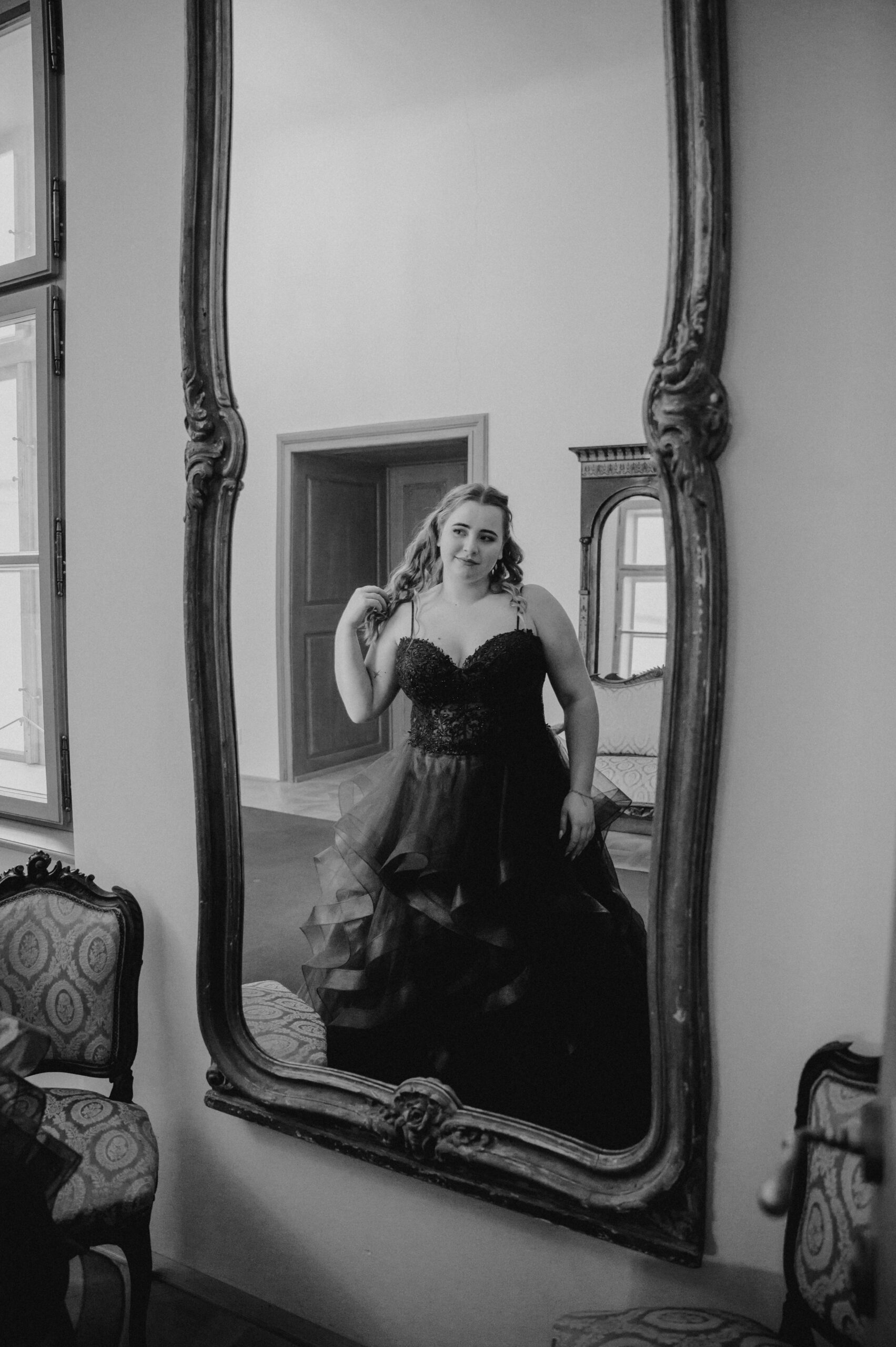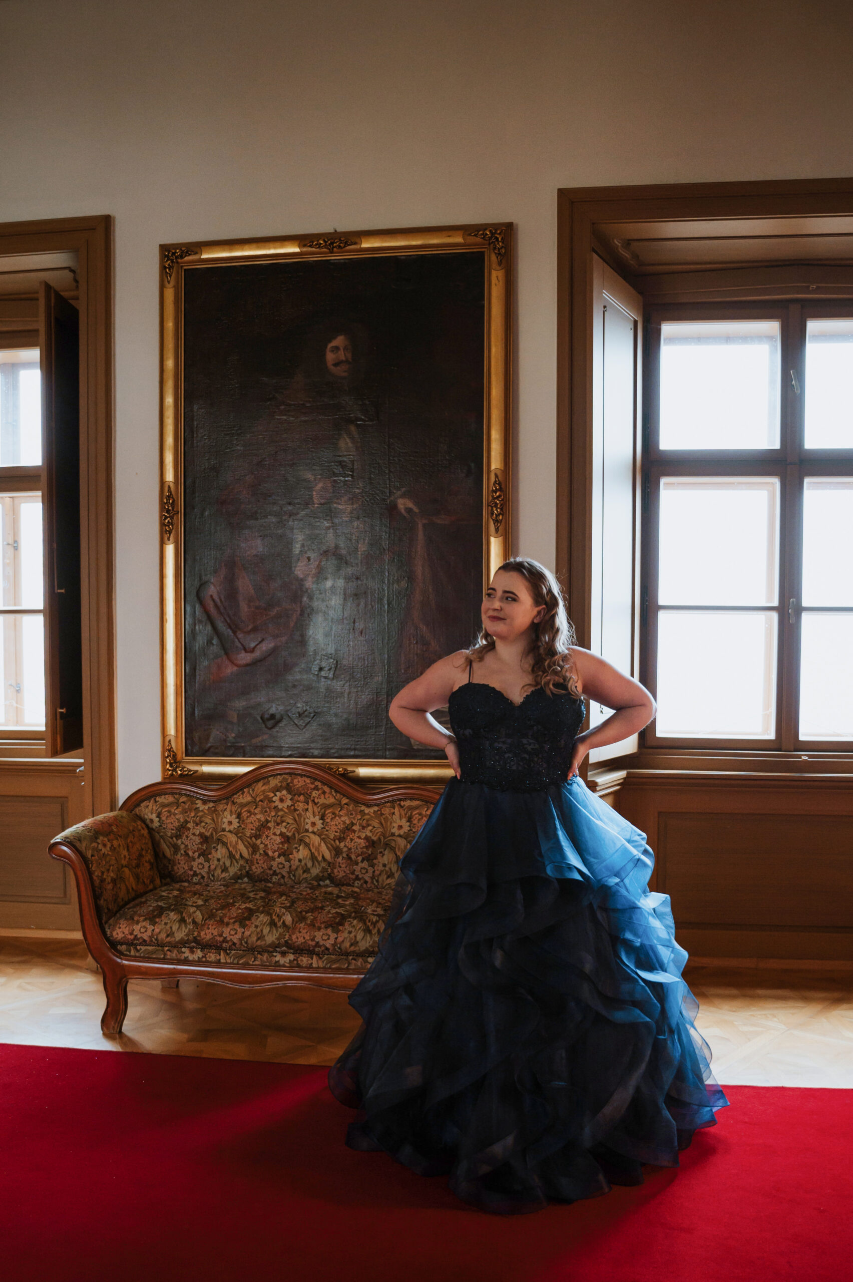 Tmavomodré spoločenské šaty s volánovou tylovou sukňou.