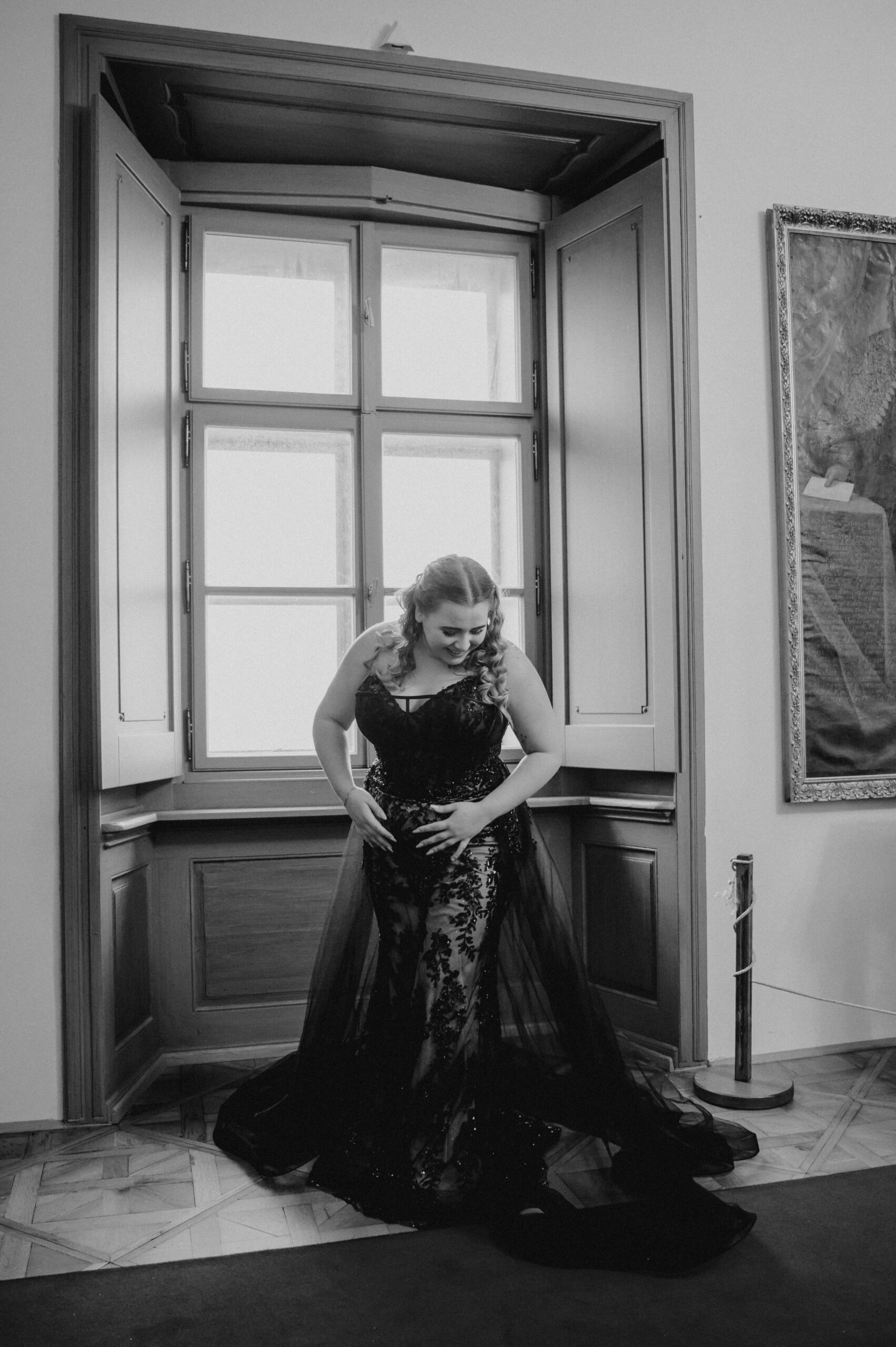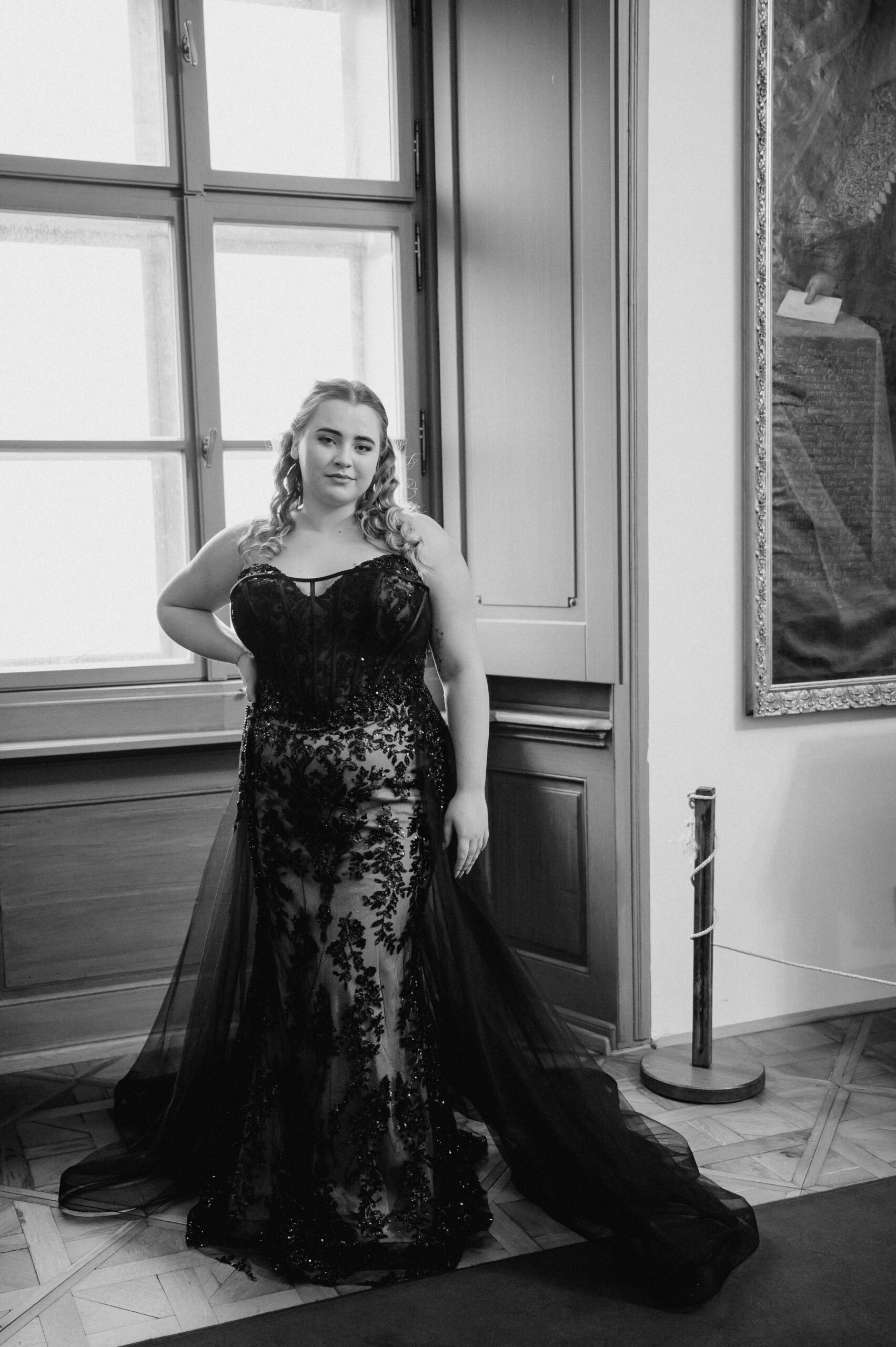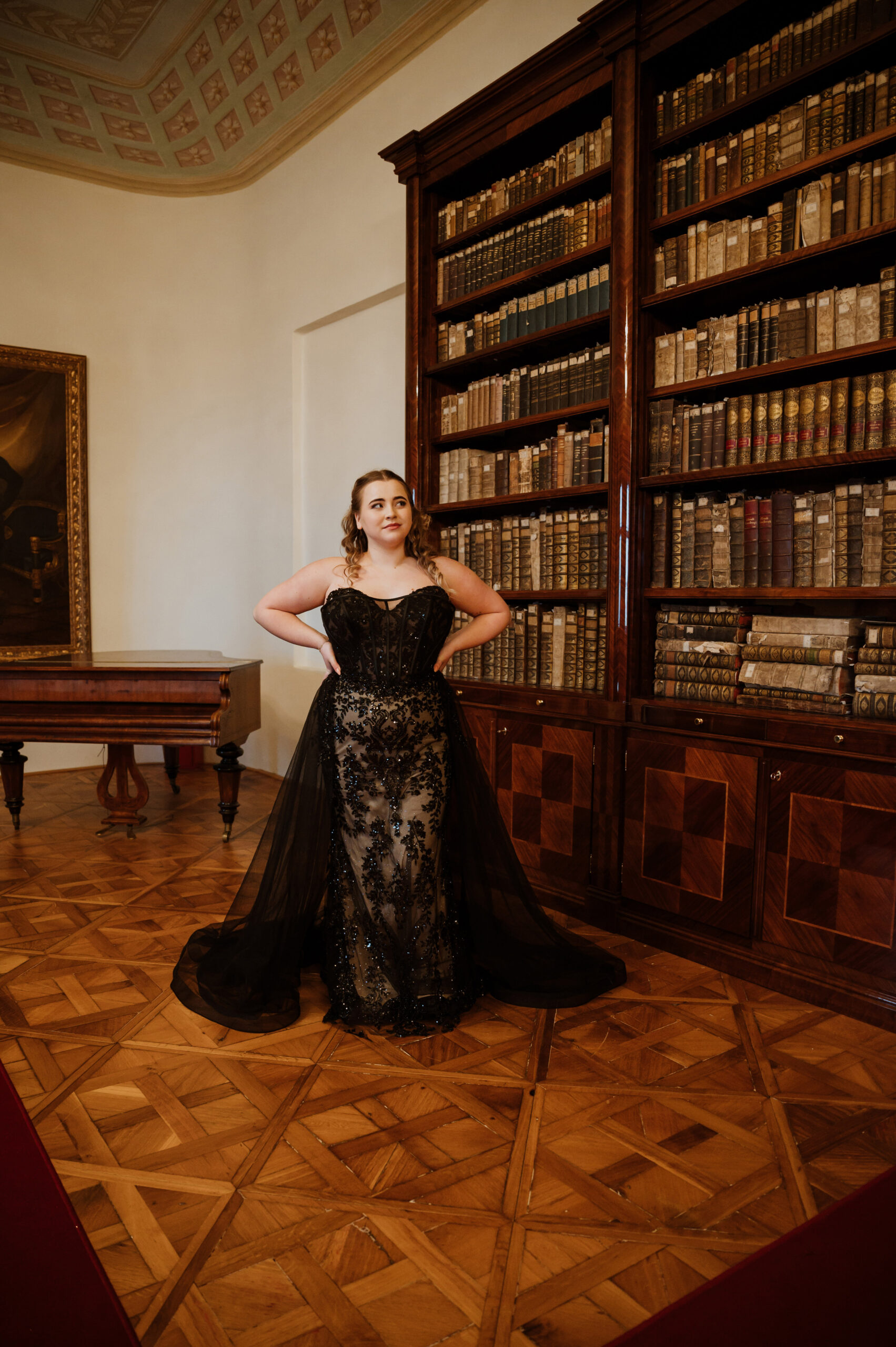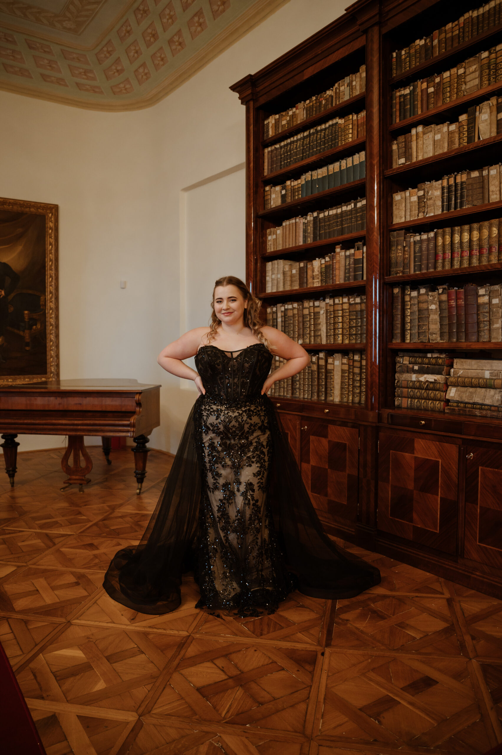 Nápadité korzetové spoločenské šaty čiernej farby s telovou podšívkou. Tieto úzke šaty sú doplnené o overskirt.