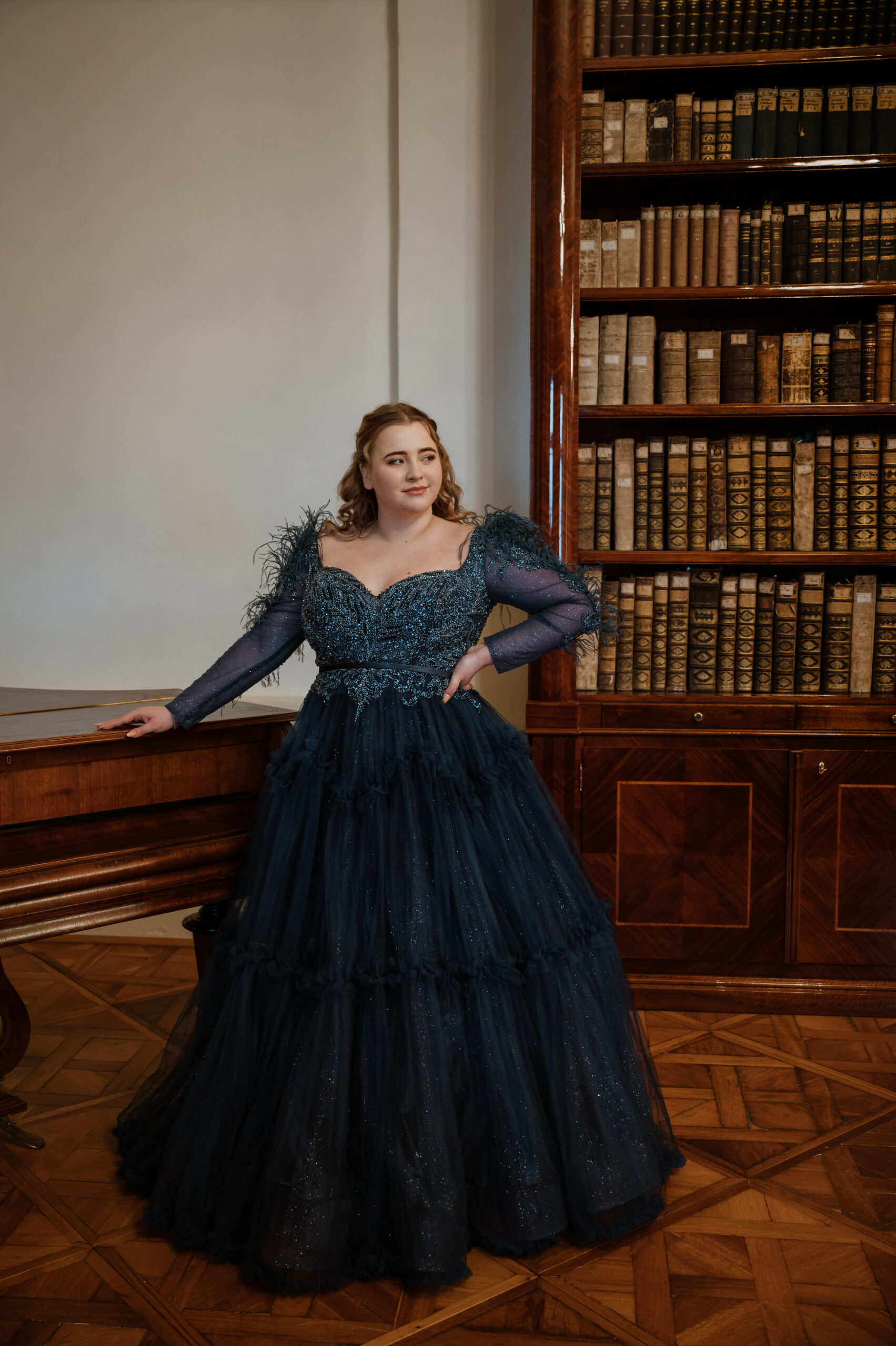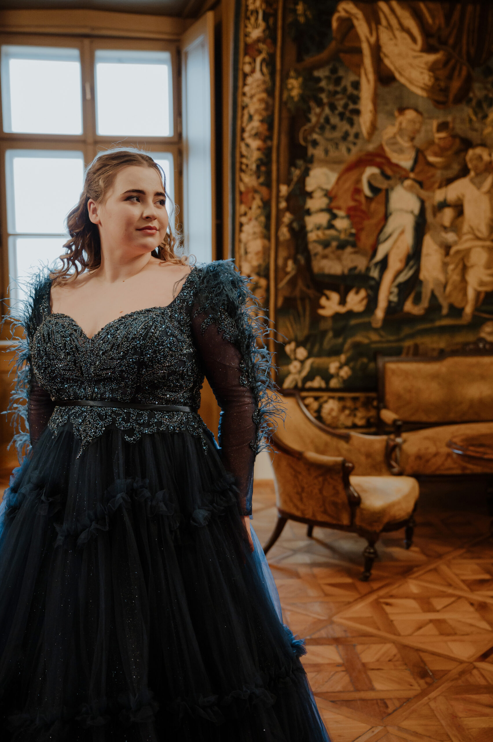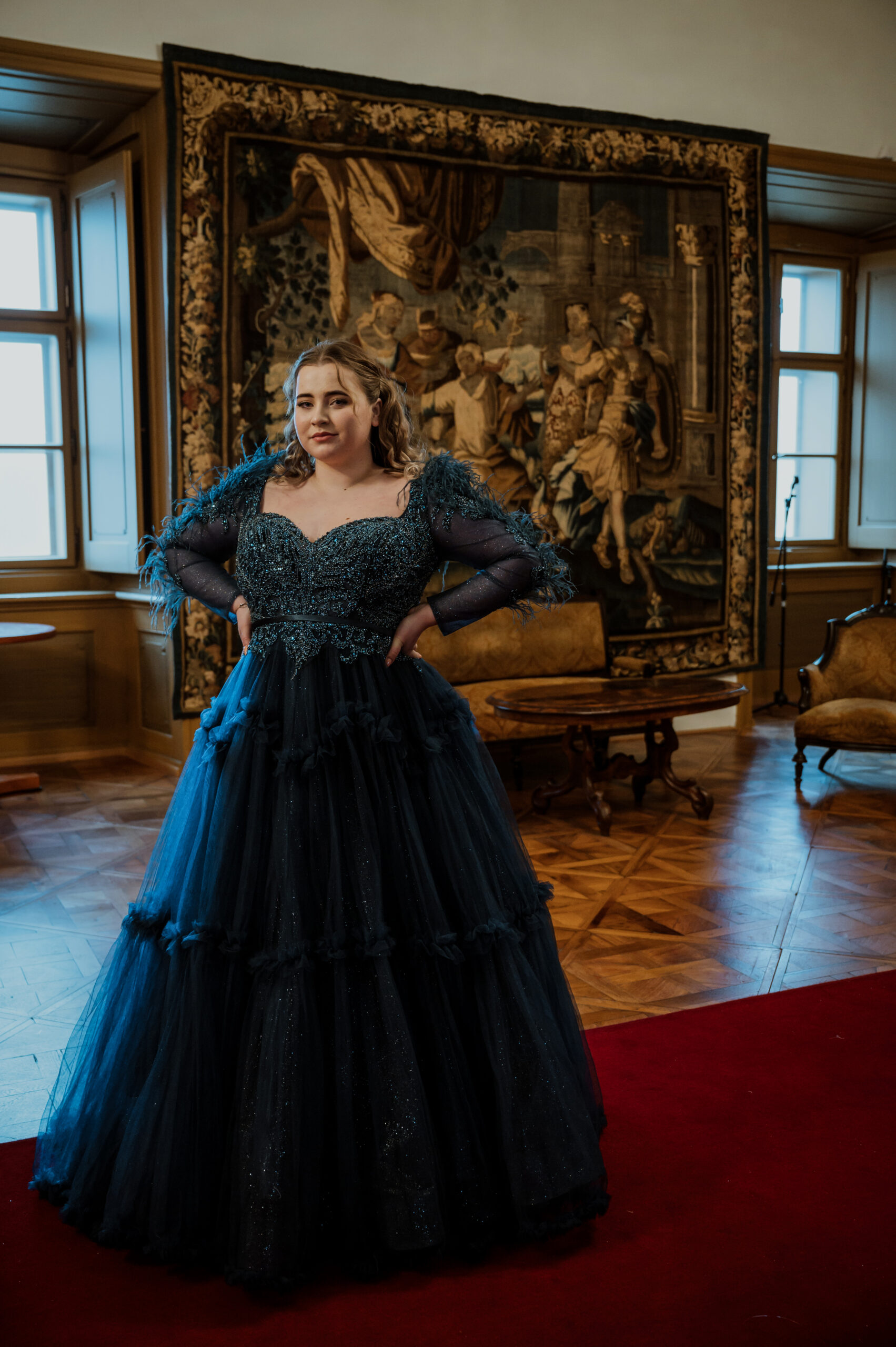 Modré spoločenské šaty Huberta s dlhými rukávmi sú dozdobené korálkovou výšivkou a pierkami. Na sukni sú mini volániky, ktoré im pridávajú hravosť a nápaditosť.